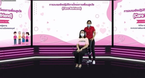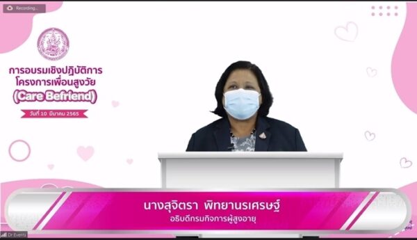 นางสุจิตรา พิทยานรเศรษฐ์ อธิบดีกรมกิจการผู้สูงอายุ กล่าวว่า กระทรวง พม. โดยการนำของ นายจุติ ไกรฤกษ์ รัฐมนตรีว่าการกระทรวง พม. (รมว.พม.) ได้ดำเนินการตามนโยบายของรัฐบาลที่ให้ความสำคัญกับการพัฒนาทุนมนุษย์ เพื่อการขับเคลื่อนงานพัฒนาสังคมและความมั่นคงในชีวิตของกลุ่มเป้าหมายตลอดทุกช่วงวัย โดยเฉพาะอย่างยิ่งในวัยผู้สูงอายุที่ต้องได้รับการดูแลอย่างใกล้ชิด เฉพาะทางและมีความหลากหลายแตกต่างกันของผู้สูงอายุแต่ละกลุ่ม แต่ในปัจจุบัน ประเทศไทยกำลังเผชิญกับปัญหาการขาดแคลนบุคลากรผู้ดูแลผู้สูงอายุ พม. โดยกรมกิจการผู้สูงอายุเห็นความสำคัญในเรื่องดังกล่าว จึงได้จัดอบรมเชิงปฏิบัติการโครงการเพื่อนสูงวัย (Care Befriend) ซึ่งได้รับการสนับสนุนวิทยากรผู้เชี่ยวชาญ และแนวทางการสร้างโอกาสในการประกอบอาชีพผู้ดูแลผู้สูงอายุรูปแบบใหม่