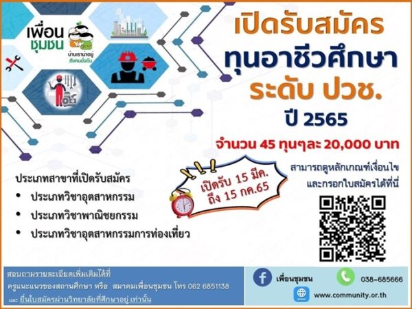 สำหรับการมอบทุน โครงการทุนอาชีวศึกษาต่อเนื่อง ในปี 2565 เปิดรับทั้งสิ้น จำนวน 45 ทุน ทุนละ 20,000 บาทต่อปี ทั้งนี้เยาวชนที่ยื่นใบสมัครต้องมีคุณสมบัติ ประกอบด้วย ต้องจบการศึกษาระดับชั้นมัธยมศึกษาปีที่3จากโรงเรียนในพื้นที่ จ.ระยอง ซึ่งต้องมีชื่ออยู่ในทะเบียนบ้านใน จ.ระยอง ไม่น้อยกว่า 3 ปี (นับแต่มีนาคม 2562 เป็นต้นไป) และต้องมีผลการเรียนเฉลี่ยสะสมตลอด 5 ภาคการศึกษา (ม.1-ม.3 ภาคแรก) ไม่ต่ำกว่า 2.70 สามารถยื่นใบสมัครได้ ตั้งแต่วันนี้เป็นต้นไป จนถึง 15 กรกฎาคม 2565 หรือ สามารถส่งใบสมัครพร้อมหลักฐาน ได้ที่ครูแนะแนวของสถาบันอาชีวศึกษาที่เรียนอยู่เท่านั้น ติดต่อสอบถามเพิ่มเติมได้ที่ ครูแนะแนวของสถานศึกษาอาชีวศึกษาที่กำหนด หรือ สมาคมเพื่อนชุมชน ทุนอาชีวศึกษาเพื่อนชุมชน (ระดับ ปวช.) ประจำปี 2565 โทรศัพท์ 062-6851138 หรือ เฟซบุ๊ก เพื่อนชุมชน และศึกษารายละเอียดได้ที่ www.community.or.th
