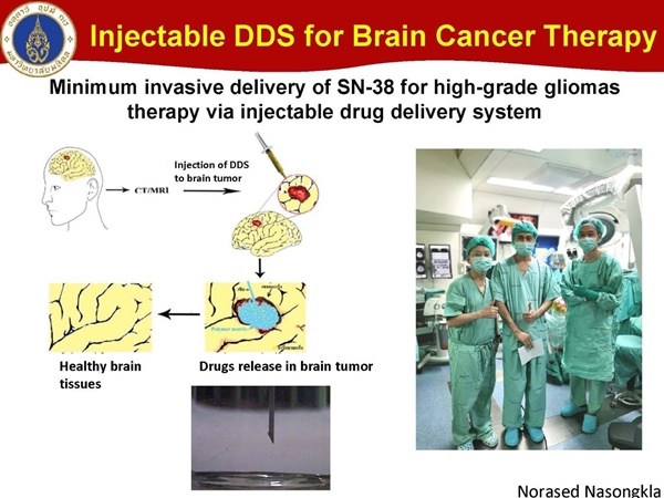 โรคมะเร็งสมอง (Brain cancer) เป็นหนึ่งในโรคที่มีอัตราการเสียชีวิตสูง รอดน้อยกว่า 10% และรักษาให้หายขาดได้ยาก ทีมวิจัย 3 คนไทยจากคณะวิศวะมหิดล ร่วมกับคณะแพทยศาสตร์รพ.รามาธิบดี มหาวิทยาลัยมหิดล คิดค้นครั้งแรกในอาเซียน นวัตกรรม ‘ระบบส่งยาฉีดรักษามะเร็งสมองจากเจลชีวพอลิเมอร์’ (Injectable Polymeric Drug Delivery System for Human Brain Cancer Treatment) พลิกโฉมหน้าใหม่ของการรักษามะเร็ง โดยส่งยาเข้าถึงเป้าหมายมะเร็งในสมองได้ตรงจุด และยับยั้งเซลล์มะเร็งสมองโดยไม่มีพิษต่อร่างกายในการทดลองกับผู้ป่วยเฟสที่ 1 และกำลังเดินหน้าเฟสที่ 2 นวัตกรรมนี้ได้รับการจดสิทธิบัตรและได้รับการตีพิมพ์ในหลายวารสารต่างประเทศ เป็นความหวังของคนไทยที่จะได้เห็นผลงานวิจัยนี้ไปสู่การผลิตใช้จริงในการต่อสู้กับมะเร็งเพื่อช่วยชีวิตคนไทยและเพื่อนมนุษย์ทั่วโลกได้จำนวนมากศ.นพ.ปิยะมิตร ศรีธรา คณบดีคณะแพทยศาสตร์ รพ.รามาธิบดี ม.มหิดล กล่าวว่า มะเร็งเป็น 1 ใน 5 โรคร้ายแรงที่คร่าชีวิตคนไทยมากที่สุด โดยข้อมูลปี 2563 มีผู้เสียชีวิตจากโรคมะเร็ง เฉลี่ยวันละ 342 คน หรือ 124,866 คนต่อปี และมีผู้ป่วยใหม่ถึง 190,636 คน แม้ว่าผู้ป่วยมะเร็งสมองจะมีสัดส่วนน้อย เพียง 1% เมื่อเทียบกับผู้ป่วยโรคมะเร็งทั้งหมด แต่การแพร่ลามของเนื้อมะเร็งจากอวัยวะอื่นๆ ย่อมก่อให้เกิดภาวะความเสี่ยงต่อการเป็นมะเร็งสมองได้เช่นกัน โรคมะเร็งสมองเป็นภาวะความผิดปกติของการเจริญเติบโตของเซลล์สมองที่มีการขยายตัวเจริญเติบโตอย่างผิดปกติ จนทำให้เกิดภาวะเริ่มแรก “เนื้องอก” ก่อนที่จะค่อยๆ ลุกลามไปกดทับเส้นเลือดหรือเส้นประสาทในสมองจนทำให้เกิดเป็นเนื้อร้ายในที่สุด ทั้งนี้ มะเร็งสมองในผู้ใหญ่โอกาสหายขาดมีน้อยไม่ถึง 10% ความสำเร็จของการพัฒนา นวัตกรรม ‘ระบบส่งยาฉีดรักษามะเร็งสมองจากเจลชีวพอลิเมอร์’ เป็นความร่วมมือวิจัยพัฒนาระหว่างคณะวิศวกรรมศาสตร์กับคณะแพทยศาสตร์โรงพยาบาลรามาธิบดี มหาวิทยาลัยมหิดล จากความมุ่งมั่นเพื่อยกระดับคุณภาพชีวิตของคนไทยในการต่อสู้กับมะเร็งสมอง และต่อยอดนำไปรักษามะเร็งชนิดอื่นๆ ในอนาคตด้วย