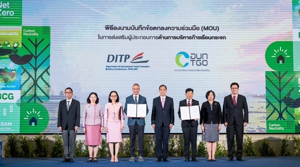 กรมส่งเสริมการค้าระหว่างประเทศ (DITP) จัดกิจกรรมเสวนาและพิธีลงนามข้อตกลงความร่วมมือ (MOU) ว่าด้วยความร่วมมือในการส่งเสริมผู้ประกอบการในด้านการบริหารก๊าซเรือนกระจก ระหว่างกรมส่งเสริมการค้าระหว่างประเทศ กระทรวงพาณิชย์ และองค์การบริหารจัดการก๊าซเรือนกระจก (องค์การมหาชน) เมื่อวันที่ 29 พฤศจิกายน 2565 โดยมีปลัดกระทรวงพาณิชย์ร่วมเป็นสักขีพยาน พร้อมทั้งเชิญผู้บริหารองค์การบริหารจัดการก๊าซเรือนกระจก ฑูตพาณิชย์มาร่วมถ่ายทอดทิศทางและโอกาสการเติบโตของภาคธุรกิจในตลาดต่างประเทศที่คำนึงถึงสิ่งแวดล้อม และนำตัวอย่างผู้ประกอบการที่มีนโยบายการดำเนินธุรกิจคาร์บอนต่ำมาร่วมถ่ายทอดประสบการณ์