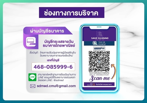 และ 3. สามารถบริจาคสมทบทุนโดยตรงกับทางคณะแพทยศาสตร์ มหาวิทยาลัยเชียงใหม่ โดยโอนเงินผ่านธนาคารไทยพาณิชย์ จำกัด (มหาชน) สาขาคณะแพทยศาสตร์ เชียงใหม่ ชื่อบัญชี โครงการปรับปรุงอาคารผู้ป่วย “สุจิณฺโณ” โรงพยาบาลมหาราชนครเชียงใหม่ เลขที่บัญชี 468-0-85999-6 (ใบเสร็จสามารถลดหย่อนภาษีได้) รายละเอียดเพิ่มเติมได้ที่มูลนิธิโรงพยาบาลสวนดอก โทร. 053-938400 และ 053-935672 งานประชาสัมพันธ์ คณะแพทยศาสตร์ มช.