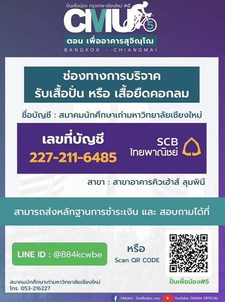 โดยเส้นทางปั่นจะเริ่มจากกรุงเทพมหานคร ไปยังจังหวัดลพบุรี นครสวรรค์ พิษณุโลก อุตรดิตถ์ แพร่ ลำปาง และสิ้นสุดมหาวิทยาลัยเชียงใหม่ ในวันเสาร์ที่ 24 ธันวาคม รวมระยะทาง 830 กิโลเมตร สำหรับผู้มีจิตศรัทธา อยากจะร่วมสมทบทุน สามารถร่วมบริจาคได้ 3 ช่องทาง คือ 1. ร่วมบริจาคกับขบวนปั่นจักรยานที่ผ่านจังหวัดต่างๆตามเส้นทาง 2. บริจาคและรับเสื้อปั่นจักรยาน หรือเสื้อยืดคอกลม ได้ที่ ชื่อบัญชีสมาคมนักศึกษาเก่ามหาวิทยาลัยเชียงใหม่ ธนาคารไทยพานิชย์ จำกัด (มหาชน ) สาขาอาคารคิวเฮ้าส์ ลุมพินี เลขที่บัญชี 227-211-6485 และส่งหลักฐานการชำระเงินได้ที่ ไลน์ไอดี @884kcwbe สอบถามข้อมูลเพิ่มเติมได้ที่ สมาคมนักศึกษาเก่ามหาวิทยาลัยเชียงใหม่ โทร. 053 216227