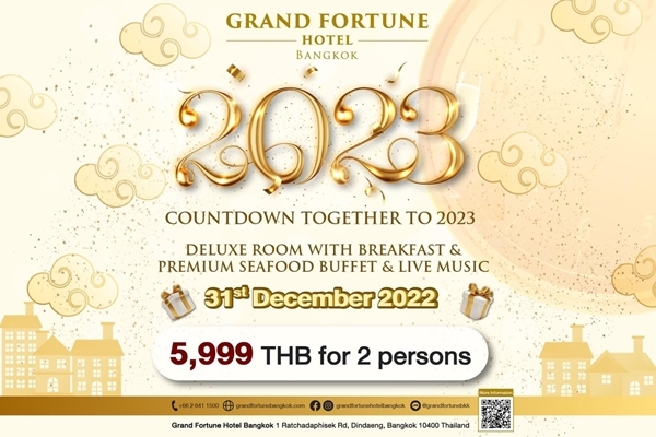ส่งท้ายปีเก่าต้อนรับเช้าวันใหม่ ณ โรงแรมแกรนด์ ฟอร์จูน กรุงเทพฯ โปรโมชั่นห้องพัก พร้อมอาหารเช้า และ พรีเมียม ซีฟู้ด บุฟเฟ่ต์ กับดนตรีสดเพราะๆ พร้อมโชว์บาเทนเดอร์ สุดเร้าใจ พร้อมเคาท์ดาวน์ร่วมกัน ในคืนวันเสาร์ที่ 31 ธันวาคม 2565 ราคาพิเศษเพียง 5,999 บาท สำหรับ 2 ท่าน พร้อมฟรี ไวน์ อีก 1 ขวด