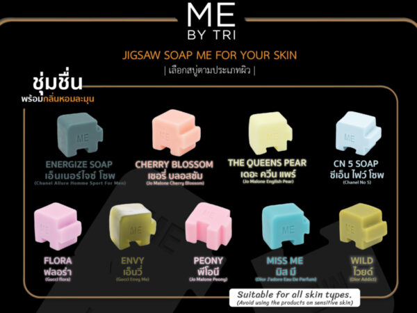 สบู่จิ๊กซอว์ ME เกรดพรีเมี่ยม มีให้เลือกถึง 25 สูตร มีส่วนผสมด้วยสารสกัดจากธรรมชาติ ใช้ได้ทั้งผู้หญิง ผู้ชาย และเด็กอายุตั้งแต่ 3 ขวบขึ้นไป แต่ละสูตรมีขนาดปริมาณก้อนละ 30 กรัม แบ่งเป็น 3 กลุ่ม คือ 1. กลุ่มน้ำหอม 9 กลิ่น 2. กลุ่มคุณสมบัติของผิวพรรณ 10 สูตร และ 3. กลุ่มสครับ 6 สูตร ที่สามารถเลือกมิกซ์แอนด์แมทช์สูตรเองได้ นำมาประกอบติดกันได้ มีหลากหลายสีสันที่สวยงามชวนให้ใช้ มีสรรพคุณช่วยให้ผิวพรรณชุ่มชื่น ไม่แห้งตึง ลดฝ้าให้จางลง รักษาปัญหาสิวและผดผื่น ทำให้ผิวรู้สึกแข็งแรงขึ้น ดูอ่อนเยาว์และกระจ่างใสมากขึ้น