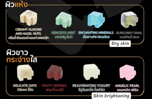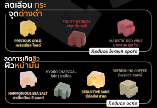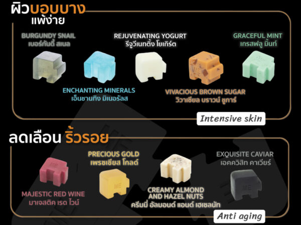 รายชื่อสบู่จิ๊กซอว์ ME เกรดพรีเมี่ยม ทั้ง 25 สูตร ที่มีให้เลือกใช้เหมาะกับทุกสภาพผิวใบหน้าของแต่ละคน ประกอบด้วยสูตรต่างๆ ดังนี้