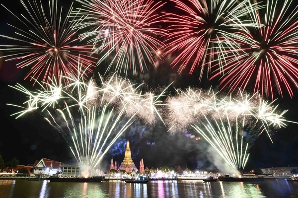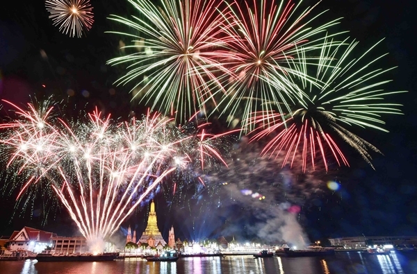 Then join the countdown to step into the new year with a spectacular fireworks show on the banks of the Chao Phraya River in a set “Dawn of Brightness, Receiving Luck, Overcoming Obstacles to Excellence Forever” that will continue for 5 minutes, totalling 5,000 shots, divided into 9 acts, consisting of Act 1 “Rerm Aroon” (Breaking Dawn)/Act 2 “Aroon Ruam Jai” (The dawn unites)/Act 3 “Pracha Ruam Mue Pracha Ruam Jai” (The people cooperation)/Act 4 “Pracha Berg Ban” (The people are joyful)/Act 5 “Pracha Samran” (The people are happy)/Act 6 “Roong Aroon Song Fah Ton Rub Wan Mai” (The dawn shines in the sky to welcome the new day)/Act 7”Saeng Aroon tor Pragai” (The dawn shines)/Act 8. “Aroon Saeng Seetong Pong Ampan” (The golden dawn shines brightly) and the 9th act “Roong Aroon Bergban Suebsan Niran”(Shining dawn Forever).