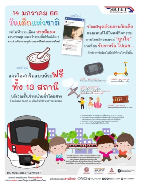 นายสุเทพ พันธุ์เพ็ง กรรมการผู้อำนวยการใหญ่ บริษัท รถไฟฟ้า ร.ฟ.ท. จำกัด ผู้ให้บริการรถไฟฟ้าชานเมืองสายสีแดง เปิดเผยว่า เมื่อถึงช่วงวันเด็กแห่งชาติในแต่ละปี บริษัทฯ จะมีการจัดกิจกรรมส่งเสริมการตลาดเพื่อมอบความสุข และสร้างรอยยิ้มให้แก่เด็ก ๆ และผู้โดยสารมาโดยตลอด โดยวันเด็กแห่งชาติ 2566 นี้ บริษัทฯ จึงได้จัดกิจกรรมการตลาดในรูปแบบออฟไลน์และออนไลน์ เพื่อให้สอดคล้องกับสถานการณ์ในปัจจุบันและยังคำนึงถึงความปลอดภัยในสถานการณ์ที่มีการแพร่ระระบาดของไวรัสโควิด-19 ด้วยการมอบความสุขให้แก่ผู้โดยสาร โดยการแจกไอศกรีมใน 13 สถานี บริเวณชั้นจำหน่ายตั๋ว ทั้งสายนครวิถี(บางซื่อ-ตลิ่งชัน) สายธานีรัถยา(บางซื่อ-รังสิต) ตั้งแต่เวลา 08.00 น. เป็นต้นไป จนกว่าของจะหมด และยังให้ผู้โดยสารได้ร่วมสนุกด้วยการโพสต์รูปภาพวัยเด็กสุดน่ารัก ใต้โพสต์กิจกรรมที่ทางรถไฟฟ้าสายสีแดงจัดขึ้น ซึ่งจะเริ่มในวันเสาร์ที่ 14 มกราคม 2566 ทางเฟซบุ๊ก RED Line SRTET ตั้งแต่เวลา 05.30 – 20.00 น. ซึ่งภาพไหนมีคอมเมนต์ใต้รูปภาพด้วยคำว่า “ถูกใจ” มากที่สุด จะได้รับรางวัลที่ 1 เป็น “เครื่องเกมพกพา Nintendo Switch Lite” , และรางวัลอื่น ๆ ตามลำดับ อาทิ Scooter สำหรับเด็ก, เครื่องบินบังคับ รถบังคับหรือโดรนบังคับ(แบบไม่มีกล้อง), ตุ๊กตาบาร์บี้, บัตรกำนัลรับประทานไอศกรีมมูลค่า 200 บาท และรางวัลอื่น ๆ อีกมากมายกว่า 30 รางวัล โดยรางวัลจะจัดส่งถึงบ้าน โดยไม่มีค่าใช้จ่ายใด ๆ ทั้งสิ้น