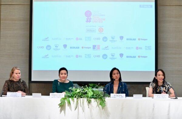 ในภาพจากซ้าย: พราวพุธ ลิปตพัลลภ ประธานเจ้าหน้าที่บริหาร พราวกรุ๊ป, โฮ เหริน ยัง (Ho Ren Yung) รองประธานอาวุโส แบรนด์และการขาย กลุ่มบันยันทรี, วัลลภา ไตรโสรัส ประธานเจ้าหน้าที่บริหาร บริษัท แอสเสท เวิรด์ คอร์ป จำกัด (มหาชน) ลิซ เพอร์กินส์ (Liz Perkins) รองประธานอาวุโส การจัดการรายได้และบริการเชิงพาณิชย์ ภูมิภาคเอเชียแปซิฟิก ฮิลตัน และ บิล บาร์เน็ต กรรมการผู้จัดการ ซีไนน์ โฮเทลเวิร์คส