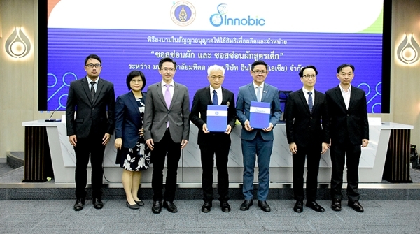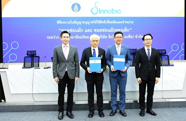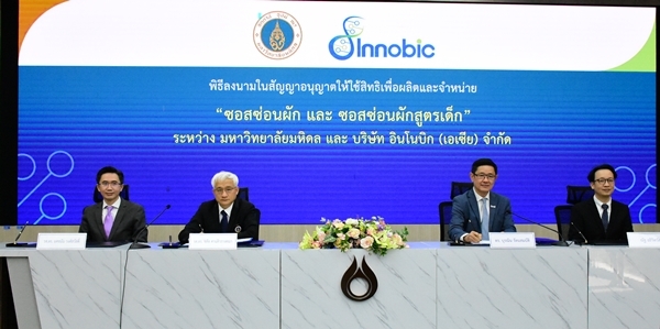 สถาบันโภชนาการ มหาวิทยาลัยมหิดล ร่วมกับ บริษัท อินโนบิก (เอเซีย) จำกัด ร่วมลงนามสัญญาอนุญาตให้ใช้สิทธิเพื่อผลิตและจำหน่ายผลิตภัณฑ์จากงานวิจัย “ซอสซ่อนผัก และ ซอสซ่อนผักสูตรเด็ก” นวัตกรรมคิดค้นและพัฒนาโดยนักวิจัย สถาบันโภชนาการ อุดมไปด้วยสารอาหารที่มีประโยชน์ต่อร่างกาย เช่น วิตามิน แร่ธาตุ เพิ่มคุณค่าทางโภชนาการ และใยอาหาร เป็นทางเลือกให้กับผู้ที่มีปัญหาเรื่องการบดเคี้ยว และเด็กๆที่อาจไม่ชอบรับประทานผัก ได้รับสารอาหารจากผักผ่านซอสซ่อนผักนี้ รวมถึงยังเป็นทางเลือกสำหรับคนรักสุขภาพอีกด้วย นอกจากนี้ผลงานวิจัย “ซอสซ่อนผัก” ได้รับการตีพิมพ์ในวารสารวิชาการระดับนานาชาติโดยมีการทดสอบในกลุ่มผู้นิยมบริโภคอาหารปิ้งย่าง เพื่อศึกษาการกำจัดสารก่อมะเร็งออกจากร่างกาย ที่มักปนมากับส่วนที่ไหม้เกรียมจาการปิ้งย่าง พบว่าอาสาสมัครกลุ่มที่มีการรับประทานซอสซ่อนผักในปริมาณที่พอเหมาะร่วมกับอาหารปิ้งย่าง จะช่วยให้สามารถกำจัดสารก่อมะเร็งที่มากับเนื้อย่างออกจากร่างกายได้ดีขึ้น