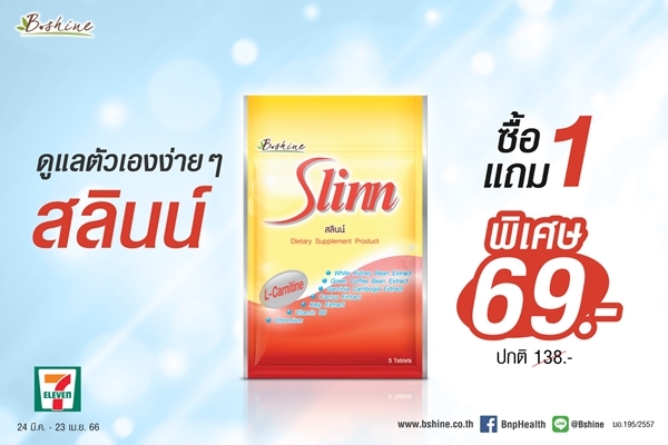 “สลินน์” ขนาดแบบซองบรรจุ 5 เม็ด (แถมฟรีอีก 2 เม็ดในซอง) จัดโปรโมชั่นพิเศษ ซื้อ 1 ซอง แถมฟรีอีก 1 ซอง เพียง 69 บาท จากปกติ 138 บาท ตั้งแต่วันนี้ – 23 เมษายน 2566 หาซื้อได้ที่ร้าน 7-Eleven