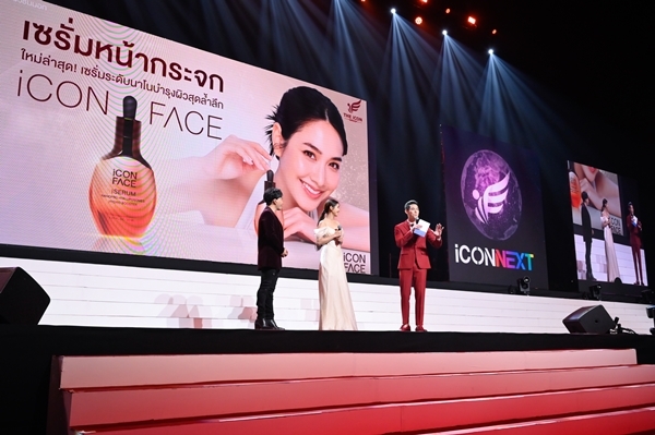 ( iCON FACE iSERUM) เซรั่มหน้ากระจก บนเวทีในงาน iCONNEXT เพื่อตอกย้ำความเป็นผู้นำทางด้านธุรกิจของดิไอคอนกรุ๊ป “ฝากเซรั่มตัวใหม่ด้วยนะคะ เป็นผลิตภัณฑ์ที่มิน ไปหาข้อมูลให้ตัวเองลอง รวมถึง product แล้วก็ลองใช้อยู่หลายเดือน เป็นเซรั่มที่มีสารสกัดจากทั่วโลกรวมมาให้หนึ่งเดียวในขวดนี้ วันนี้ก็ได้เปิดตัวมาแล้ว”.
