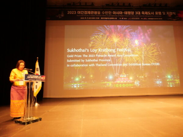 สำนักงานส่งเสริมการจัดประชุมและนิทรรศการ (องค์การมหาชน) สสปน. หรือทีเส็บ ได้ดำเนินงานร่วมกับจังหวัดสุโขทัย ส่งงานลอยกระทงเผาเทียนเล่นไฟ จังหวัดสุโขทัย เข้าประกวดรางวัลงานเทศกาลที่มีศักยภาพ (ธีมงานกลางคืน) ประจำปี 2023 ของสมาคมการจัดงานอีเวนท์และเทศกาลนานาชาติ หรือ International Festival & Events Association (IFEA) ภูมิภาคเอเชีย (ASIA Chapter) โดยงานลอยกระทงของจังหวัดสุโขทัยคว้ารางวัล Gold Prize ร่วมกับงานพลุนานาชาติของเมืองพัทยา ซึ่งมีการจัดพิธีมอบรางวัลแก่จังหวัดสุโขทัยและเมืองพัทยา ณ เมืองทงยอง (City of Tongyeong) จังหวัด คยองซังใต้ (Gyeongsangnam-do) สาธารณรัฐเกาหลี (Republic of Korea) เมื่อวันที่ 2 มิถุนายน 2566 ที่ผ่านมา โดยมีผู้แทนจังหวัดสุโขทัย คือ นางสาวพัชรอร วงศ์กำแหง รองผู้ว่าราชการจังหวัดสุโขทัย เป็นผู้รับมอบรางวัลร่วมกับภาคเอกชนจังหวัดสุโขทัย และนายภูริพันธ์ บุนนาค รองผู้อำนวยการสำนักงานส่งเสริมการจัดประชุมและนิทรรศการ (องค์การมหาชน) ได้เข้าร่วมรับรางวัลในครั้งนี้ด้วย