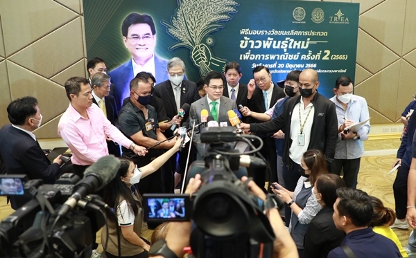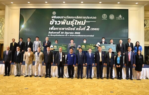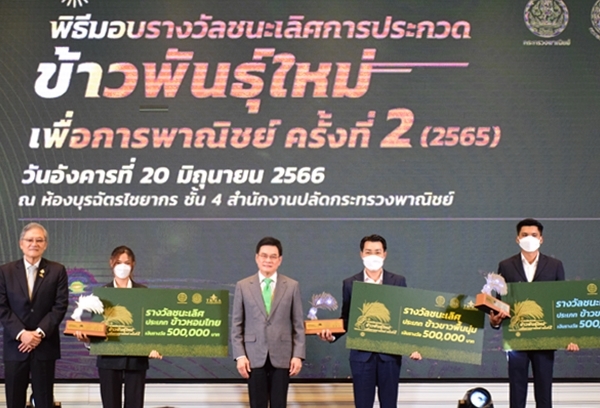 วันที่ 20 มิถุนายน 2566 เวลา 14.30 น. ที่กระทรวงพาณิชย์ นายจุรินทร์ ลักษณวิศิษฏ์ รองนายกรัฐมนตรีและรัฐมนตรีว่าการกระทรวงพาณิชย์ พร้อมด้วย นายกีรติ รัชโน ปลัดกระทรวงพาณิชย์ นายรณรงค์ พูลพิพัฒน์ อธิบดีกรมการค้าต่างประเทศ ร.ต.ท. เจริญ เหล่าธรรมทัศน์ นายกสมาคมผู้ส่งออกข้าวไทย สมาคมการค้าเมล็ดพันธุ์ข้าวไทย นักวิจัย ผู้บริหารกระทรวงพาณิชย์และกระทรวงเกษตรและสหกรณ์ มอบรางวัลการประกวดข้าวพันธุ์ใหม่เพื่อการพาณิชย์ ครั้งที่ 2 พร้อมชูนโยบายตลาดนำการผลิต ผลักดันข้าวไทยพันธุ์ใหม่ออกไปแข่งขันในตลาดโลก