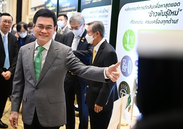 ปีนี้เป็นปีที่ 2 ได้ข้าวพันธุ์ใหม่เพิ่มมาอีก 3 พันธุ์ ภายใน 3 ปี 63-65 วันนี้ทะลุเป้าแล้ว รวมกับของกรมการข้าว อีก 12 พันธุ์ รวมทำข้าวพันธุ์ใหม่ได้แล้ว 21 พันธุ์ ทะลุเป้าทั้งเชิงปริมาณจำนวนพันธุ์ข้าวและเงื่อนเวลาเร็วกว่าเป้าปี 67 ขอบคุณทุกคนที่มีส่วนสำคัญจากนี้จะฝากกรมการข้าวและกรมการค้าต่างประเทศกระทรวงพาณิชย์ ช่วยกันสนับสนุนให้เกิดขึ้นต่อไป และขอให้กรมการข้าวเร่งรัดการจดทะเบียนข้าวพันธุ์ใหม่จากการตัดสินการประกวดวันนี้โดยเร็ว เร่งผลิตเมล็ดพันธุ์ ทดลองปลูกในแปลงเกษตรกร นำผลผลิตไปเปิดตลาดข้าวโลกต่อไป ตนหวังว่าการส่งออกข้าวไทยจากนี้จะดีขึ้น ไทยจะมีผลิตภัณฑ์จากข้าวที่มีความหลากหลายขายตลาดโลกมากขึ้น