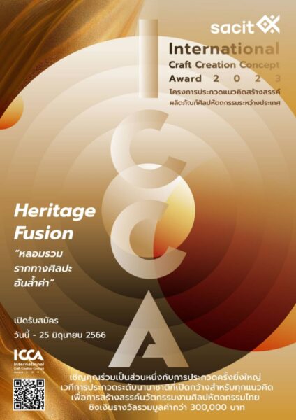กลับมาอย่างยิ่งใหญ่กับการประกวดแนวคิดสร้างสรรค์ผลิตภัณฑ์ศิลปหัตถกรรมระหว่างประเทศ International Craft Creation Concept Award 2023 หรือ I.CCA. การออกแบบผลงานศิลปหัถตกรรมไทยที่พร้อมจะก้าวไกลระดับโลก ชิงเงินรางวัลรวมกว่า 300,000 บาท สถาบันส่งเสริมศิลปหัตถกรรมไทย (องค์การมหาชน) sacit เชิญชวนนักออกแบบ และกลุ่มผู้ผลิตงานศิลปหัตถกรรม เข้าร่วมโครงการประกวด I.CCA. ภายใต้แนวคิด “ Heritage Fusion: หลอมรวมรากศิลปะอันล้ำค่า” ตั้งแต่บัดนี้ – 25 มิถุนายน 2566