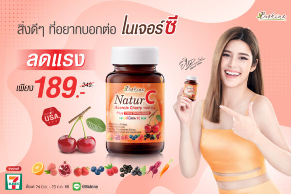 “บีไชน์ เนเจอร์ซี” (B Shine NaturC) วิตามินซีจากธรรมชาติ อะเซโรลา เชอร์รี่ สกัดเข้มข้น จากสหรัฐอเมริกา วิตามินซีมีส่วนช่วยในการทำหน้าที่ตามปกติของระบบภูมิคุ้มกัน มีส่วนช่วยในการสร้างคอลลาเจนเพื่อการทำงานตามปกติของผิวหนัง และมีส่วนช่วยในกระบวนการต่อต้านอนุมูลอิสระ ผสานคุณประโยชน์ของผลไม้สกัด ที่อุดมไปด้วยไฟโตนิวเทรียนท์และสารต้านอนุมูลอิสระประสิทธิภาพสูง ให้ผิวสวยใส สุขภาพดี “บีไชน์ เนเจอร์ซี” เป็นวิตามินซีธรรมชาติ 100% จึงสามารถดูดซึมเข้าสู่ร่างกายได้ดี และคงอยู่ในร่างกายได้นาน ไม่ระคายเคืองกระเพาะอาหาร ทั้งยังมีซิตรัสไบโอฟลาโวนอยด์ในปริมาณสูงที่มีคุณสมบัติช่วยเพิ่มการดูดซึมวิตามินซีเข้าสู่ร่างกายให้ดียิ่งขึ้น บีไชน์ เนเจอร์ซี แบบเม็ด ทานง่าย เหมาะสำหรับผู้ที่รักสุขภาพทั้งวัยหนุ่มสาวและผู้สูงอายุ