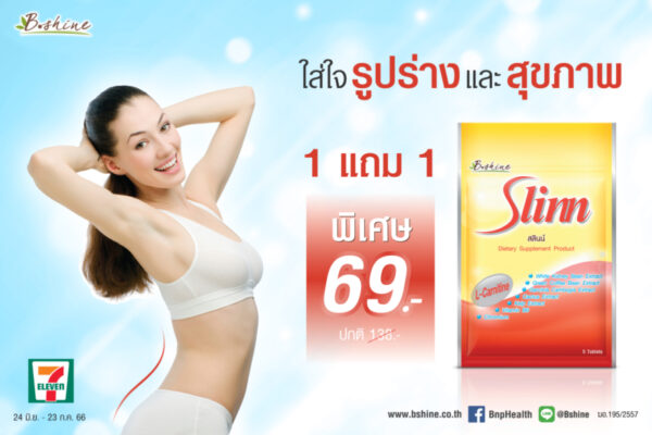 “สลินน์” ขนาดแบบซองบรรจุ 5 เม็ด (แถมฟรีอีก 2 เม็ดในซอง) จัดโปรโมชั่นพิเศษ ซื้อ 1 ซอง แถมฟรีอีก 1 ซอง เพียง 69 บาท จากปกติ 138 บาท ตั้งแต่วันนี้ – 23 กรกฎาคม 2566 หาซื้อได้ที่ร้าน 7-Eleven ทุกสาขาใกล้บ้าน สามารถดูข้อมูลเพิ่มเติมได้ที่ www.bshine.co.th, FB : https://www.facebook.com/BnpHealth และ Line : @Bshine