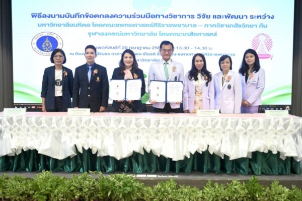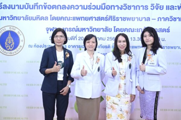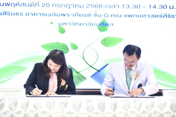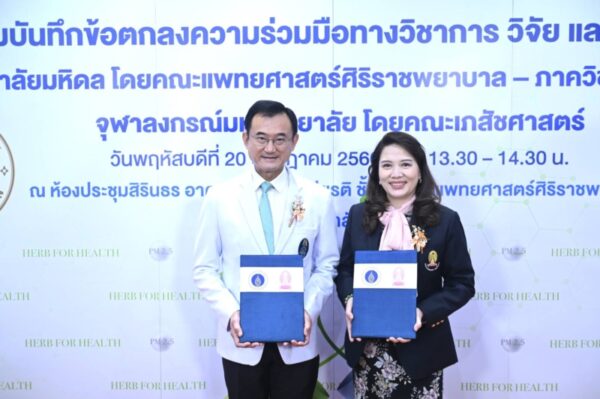 เมื่อวันพฤหัสบดีที่ 20 กรกฎาคม 2566 ณ ห้องประชุมสิรินธร อาคารเฉลิมพระเกียรติ ชั้น G คณะแพทยศาสตร์ศิริราชพยาบาล มหาวิทยาลัยมหิดล ได้มีการลงนามบันทึกข้อตกลงความร่วมมือทางวิชาการ วิจัย และพัฒนา ในโครงการ Herb for Health ระหว่างมหาวิทยาลัยมหิดล โดยคณะแพทยศาสตร์ศิริราชพยาบาล และภาควิชาเภสัชวิทยา จุฬาลงกรณ์มหาวิทยาลัย โดยคณะเภสัชศาสตร์ เพื่อพัฒนาผลิตภัณฑ์ยาจากสมุนไพรไทยเพื่อช่วยชะลอ รักษา และบรรเทาปัญหาสุขภาพต่าง ๆ ที่จะเกิดขึ้น โดยเฉพาะอย่างยิ่งปัญหาจากฝุ่น PM2.5