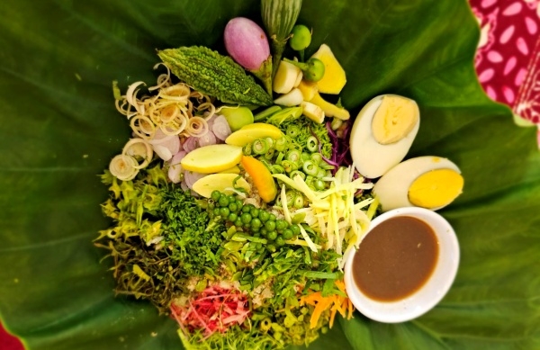 ข้าวยำสูตรวังยะหริ่ง ทำมาเสริฟอย่างพิถีพิถัน ด้วยเครื่องเยอะมากมายใช้ผักถึง 33 ชนิด คิดดูสิว่า กว่าจะซอยผักครบทุกชนิดจะใช้เวลานานขนาดไหน ราดด้วยน้ำบูดูสูตรพิเศษ แกล้มกับไก่กอแระ ปลากอแระ ผักเคียง ที่มี แตงกวา พริกขี้หนู มะเขือ สะตอ โดยเฉพาะเมื่อทานข้าวยำไปแล้ว ดื่มน้ำชาตามลงไป มันวิเศษมากมาย ตบท้ายกันด้วย ผลไม้พื้นบ้าน ลองกอง และรูกู ต้องยกนิ้วให้เชฟกิตติมศักดิ์ เจ้าคะ