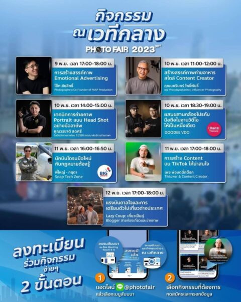พร้อมกันนี้ พบกับนิทรรศการภาพถ่าย “10 ช่างภาพ 100 เรื่องราว” จากศิลปินแห่งชาติ และช่างภาพมืออาชีพชื่อดัง ยังมีกิจกรรมพิเศษให้ความรู้และเทคนิคต่างๆ เกี่ยวกับการถ่ายภาพจากช่างภาพมืออาชีพ และเหล่า Influencer ชื่อดัง เช่น พ่อมดติ๊กต๊อก และเพจ Lazy Coup เที่ยวเป็นคู่ เป็นต้น และยังมีกิจกรรมประกวดการถ่ายภาพและประกวด TikTok ในหัวข้อ Real Life – Real Images มูลค่ารวม 100,000 บาท พบกับขบวนพาเหรด Cosplay กับการทำ Workshop การถ่ายภาพ และประกวดถ่ายภาพ Cosplay