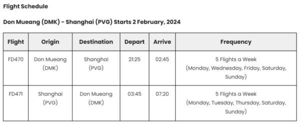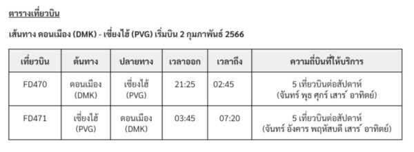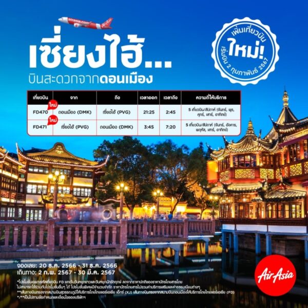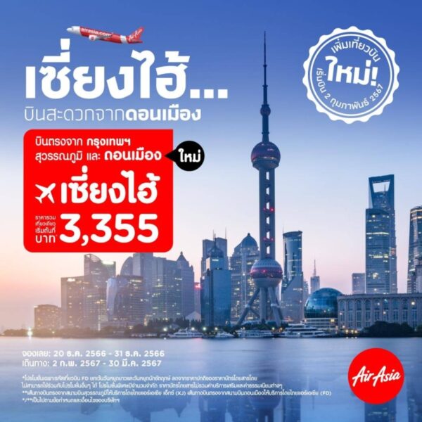 กรุงเทพฯ วันที่ 18 ธันวาคม 2566 – ไทยแอร์เอเชีย (รหัสเที่ยวบิน FD) ให้บริการเส้นทางบินใหม่ บินตรงจากดอนเมือง สู่ เซี่ยงไฮ้ ประเทศจีน ซึ่งถือเป็นครั้งแรกที่ไทยแอร์เอเชียให้บริการในเส้นทางดังกล่าว ให้บริการโดยเครื่องบินแบบแอร์บัส A320 ใช้เวลาบินประมาณ 4.30 ชั่วโมง เริ่มให้บริการตั้งแต่วันที่ 2 กุมภาพันธ์ 2567 จำนวน 5 เที่ยวบินต่อสัปดาห์ (จันทร์ พุธ ศุกร์ เสาร ์ และอาทิตย์) ในราคาโปรโมชั่น เริ่มต้นที่ 3,355 บาทต่อเที่ยวบิน จองได้เลยตั้งแต่วันที่ 20 ธันวาคม – วันที่ 31 ธันวาคม 2566 เพื่อใช้เดินทางได้ตั้งแต่วันที่ 2 กุมภาพันธ์ – วันที่ 30 มีนาคม 2567
