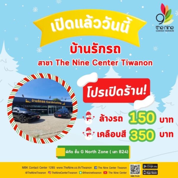 เดอะไนน์ เซ็นเตอร์ ติวานนท์ ศูนย์การค้าในเครือเอ็ม บี เค เปิดคาร์แคร์ดี มีคุณภาพ ราคาย่อมเยา บ้านรักรถ Cardetailing ที่ครบครันด้วยบริการต่าง ๆ ทั้ง ล้างรถ ดูดฝุ่น ขัดสี เคลือบเซรามิค ฟอกเบาะ อบโอโซน ติดฟิล์มกันรอย ติดฟิล์มกรองแสง เป็นต้น ที่สำคัญใช้ผลิตภัณฑ์จากแบรนด์ชั้นนำ และพิเศษ ! ฉลองเปิดสาขาใหม่กับโปรโมชันสุดคุ้ม ล้างรถทุกขนาด ราคาเริ่มต้น 150 บาท และเคลือบสี 350 บาท เท่านั้น ตั้งแต่วันนี้ – 31 มีนาคม 2567