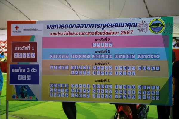 ผลการออกรางวัลที่ 1 หมายเลข 25890 ผู้โชคดี คือ นายรุ่งโรจน์ ภู่สกุล ต.เหมาะ อ.กะปง จ.พังงา ได้รับรถยนต์มิตซูบิชิ เอ็กซ์แพนเดอร์ ผลการออกรางวัลที่ 2 หมายเลข 26127 ผู้โชคดี คือ นางสาวนารีรัตน์ อ๋องพู่ ต.ท่านา อ.กะปง จ.พังงา ได้รับรถยนต์มิตซูบิชิ มิราจ โดยนายกเหล่ากาชาดจังหวัดพังงาจะได้มอบรางวัลให้กับผู้โชคดีต่อไป สำหรับผู้ที่ถูกรางวัลสามารถนำหลักฐานไปขอรับรางวัลได้ที่สำนักงานเหล่ากาชาดจังหวัดพังงา ภายในวันที่ 4 มีนาคม 2567 ตามวันและเวลาราชการ
