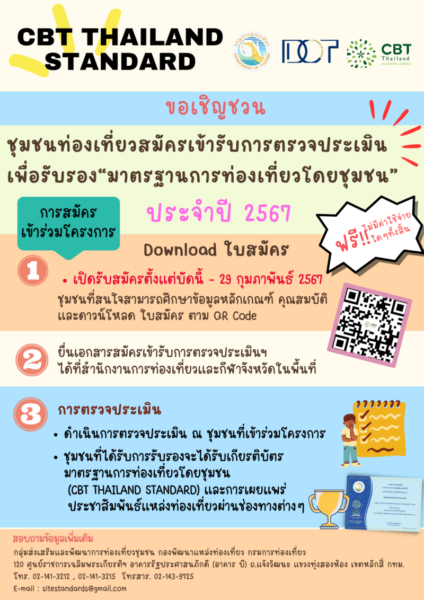 กรมการท่องเที่ยวเชิญชุมชนท่องเที่ยว สมัครขอรับการตรวจประเมินและรับรองมาตรฐานการท่องเที่ยวโดยชุมชน ประจำปี 2567 โดยชุมชนที่ผ่านการประเมินและได้รับการรับรองจะได้รับเกียรติบัตรมาตรฐานการท่องเที่ยวโดยชุมชน (CBT Thailand Standard) ซึ่งแสดงถึงศักยภาพของชุมชนในการรองรับนักท่องเที่ยว พร้อมทั้งเป็นการสร้างความเชื่อมั่นให้แก่นักท่องเที่ยว อันจะนำไปสู่การสร้างโอกาสและรายได้ให้กับชุมชนท่องเที่ยวมากยิ่งขึ้น โดยส่งใบสมัครได้ที่สำนักงานการท่องเที่ยวและกีฬาจังหวัดในพื้นที่ทั่วประเทศ จนถึงวันที่ 29 กุมภาพันธ์นี้