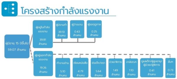 โครงสร้างกำลังแรงงานของประชากรในเดือนมกราคม 2567 ผู้มีอายุตั้งแต่ 15 ปีขึ้นไป จำนวน 59.07 ล้านคน เป็นผู้ที่อยู่ในกำลังแรงงานหรือผู้ที่พร้อมจะทำงาน 39.81 ล้านคน ประกอบด้วยผู้มีงานทำ 39.13 ล้านคน ผู้ว่างงาน 0.43 ล้านคน และผู้ที่รอฤดูกาล 0.25 ล้านคน ส่วนผู้ที่อยู่นอกกำลังแรงงานหรือผู้ที่ไม่พร้อมทำงาน 19.26 ล้านคน ได้แก่ แม่บ้าน นักเรียน ยังเด็ก/ชรา ป่วย/พิการ เป็นต้น ทั้งนี้ เมื่อเปรียบเทียบกับเดือนธันวาคม 2566 ผู้มีงานทำลดลง 1.00 ล้านคน(จาก 40.13 ล้านคน เป็น 39.13 ล้านคน) โดยผู้มีงานทำในภาคเกษตรกรรม ลดลงจำนวน 2.25 ล้านคน และผู้มีงานทำนอกภาคเกษตรกรรม เพิ่มขึ้นจำนวน 1.25 ล้านคน