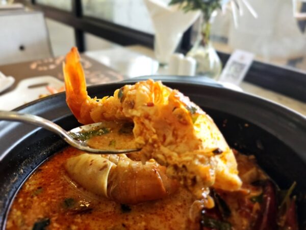เริ่มกันที่ กุ้งแม่น้ำต้มยำน้ำข้น ( “Tom Yum” Spicy & Sour Creamy Soup with River Prawn ) ต้มยำข้นๆ ซดน้ำร้อนๆ ให้รสชาติจี๊ดจ๊าดถึงใจ มาพร้อมกับกุ้งแม่น้ำขนาดกำลังพอดี ถูกปากทั้งคนไทยและต่างชาติที่เข้ามาชิมกันเลยทีเดียว
