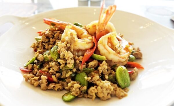 และที่ขาดไม่ได้สำหรับอาหารไทยภาคใต้เห็นจะเป็น ผัดสะตอ หน้าร้อนปีนี้ เชฟนำเสนอ ผัดสะตอกุ้งกับหมู ( Stir Fried Bitter Beans with Ground Pork and Shrimp ) รสชาติจัดจ้าน เมนูยอดนิยมของชาวใต้ที่หลายคนบอกว่า หรอยแรง เช่นกัน ถือเป็นอีกหนึ่งเมนูที่มีส่วนผสมที่ลงตัวระหว่างรสชาติของสะตอ กะปิ และกุ้งสด