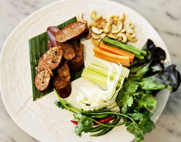 ไส้อั่วย่าง ( Sai Oua Grilled Northern Thai Pork Sausage ) อาหารพื้นบ้านล้านนา ที่ถือเป็นอาหารเอกลักษณ์และเสน่ห์ทางวัฒนธรรมของภาคเหนือ โดยนำไส้อั่วมาจัดวางด้วยผักเครื่องเคียงและเมล็ดมะม่วงหิมพานต์ให้รสชาติที่กลมกล่อมเข้ากันได้เป็นอย่างดี