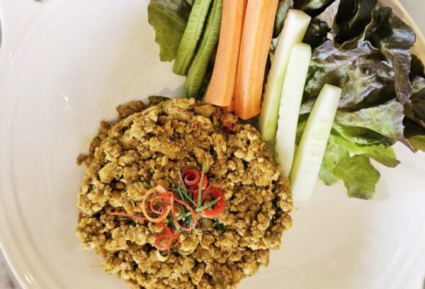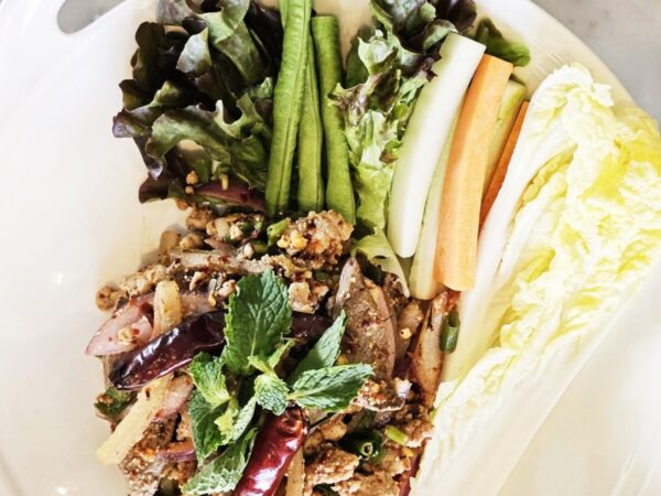 หลังจากลิ้มลองส้มตำไทยกับกุ้งแม่น้ำย่างตัวใหญ่หอมกรุ่นแล้ว ก็ตามมาด้วยเมนู ลาบหมู ( Spicy Minced Pork Salad )