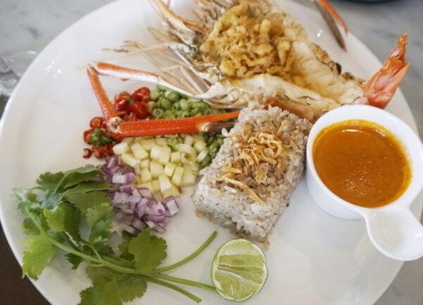 และเมนูสุดท้าย เมนูอาหารจานเดียว ทานง่าย รวดเร็ว อร่อยทันใจ ข้าวผัดกะปิกับฉู่ฉี่กุ้งแม่น้ำ ( Shrimp Paste Fried Rice with River Prawn Dried Red ) ข้าวผัดกะปิวางเคียงกุ้งแม่น้ำตัวเป้งทานคู่กับซอสฉู่ฉี่ที่แยกใส่ถ้วยเพื่อให้ราดได้มากน้อยตามแต่ใจเช่นกัน เป็นอีกหนึ่งเมนูที่อยากให้ลิ้มลองกัน เพราะแค่ได้ชิมข้าวผัดหอมกลมกล่อมแล้ว กุ้งแม่น้ำตัวใหญ่ผ่าครึ่งมันเต็มหัว ราดด้วยซอสฉู่ฉี่ อร่อยจริง… ขอบอก