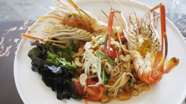 ถัดมาเป็น ส้มตำไทยกับกุ้งแม่น้ำย่าง ( Papaya Salad with Grilled River Prawn ) ต้องบอกว่า ที่นี่ขึ้นชื่อเรื่องกุ้งแม่น้ำตัวเขื่องที่นำมาเสริฟเป็นทุนเดิมอยู่แล้ว เมื่อรังสรรค์ส้มตำไทยมาพร้อมกับกุ้งแม่น้ำย่างเสริฟเข้าด้วยกัน เมนูจานนี้ก็โดดเด่นไม่แพ้เมนูอื่น ถือเป็นหนึ่งเมนูที่ได้รับความนิยมจากลูกค้าที่เข้ามาทานอาหารที่นี่เป็นอย่างมาก