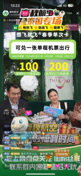 เมื่อวันที่ 17 เมษายน 2567 ณ ศูนย์การค้า The Emsphere ผู้ว่าการฯ ททท. นางสาวฐาปนีย์ เกียรติไพบูลย์ ร่วมกับรองประธานบริษัทสปริงแอร์และโฆษกประจำสายการบินสปริงแอร์ไลน์ นายจาง อู่อัน ถ่ายทอดสด Live Streaming ผ่านช่องทาง 抖音 TikTok ของสายการบิน Spring Airlines ซึ่งเป็นสายการบินให้บริการเส้นทางจาก นครเซี่ยงไฮ้ นครกว่างโจว เมืองซีอาน เฉิงตู ซัวเถา หนานหนิง และหนิงโป มีจำนวนไฟล์ทมากถึง 100 เที่ยวบิน/สัปดาห์