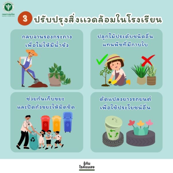 กรมควบคุมโรค กระทรวงสาธารณสุข เฝ้าระวังโรคไข้เลือดออกในช่วงเปิดเทอม ซึ่งเป็นช่วงที่กำลังเริ่มเข้าหน้าฝน จึงขอความร่วมมือประชาชนและสถานศึกษาช่วยกันจัดการสิ่งแวดล้อม กำจัดแหล่งเพาะพันธุ์ลูกน้ำยุงลายบริเวณรอบๆ ชุมชน สถานศึกษา และบริเวณบ้าน โดยการเก็บของให้เป็นระเบียบ และป้องกันตนเอง ไม่ให้ยุงกัด
