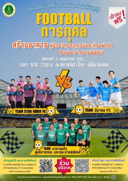 จึงจัดงานแข่งขันฟุตบอลการกุศลเพื่อประชาสัมพันธุ์ บอกบุญ เพื่อขอรับเงินบริจาค สมทบทุน สร้างตึกสำหรับผู้ป่วยวิกฤตฉุกเฉิน(ICU)และห้องผ่าตัด พื้นที่ 4500 ตารางเมตร เพื่อเพิ่มบริการให้ผู้ป่วยวิกฤตฉุกเฉิน(ICU) อีก 40 เตียง และสร้างห้องผ่าตัดเพิ่มเติม อีก 8 ห้อง เช่น ผ่าตัดสมองและกระดูกสันหลัง จะจัดงานวันที่ 21 พฤษภาคม 2567 เวลา 16.30-22.00 น. ที่สนามไทย-ญี่ปุ่น ดินแดง
