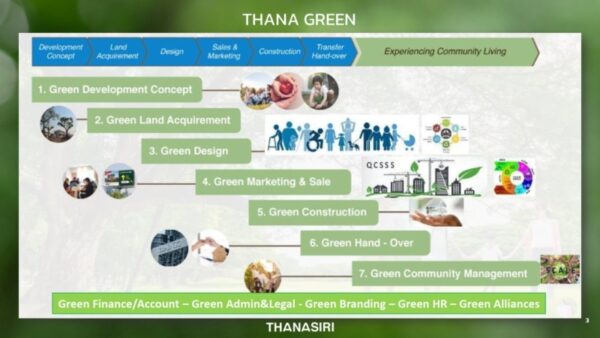 Green ในบริบทของ Total Green Real Estate Development – Services หรือ THANA GREEN นั้น ขับเคลื่อนผ่านมิติหลักสำคัญที่เกี่ยวข้องกับ ตัวบ้าน (Hardware) กระบวนการพัฒนา (Software) และ ผู้คน (People) ตั้งแต่เริ่มแนวคิดการพัฒนา (Green Development Concept) – จัดหาที่ดิน (Green Land Acquirement) – ออกแบบ (Green Design) – นำเสนอลูกค้า (Green Sale & Marketing) – ก่อสร้าง (Green Construction) – ส่งมอบ (Green Hand – Over) – เข้าอยู่อาศัย (Green Community Management) สนับสนุนด้วยกระบวนการดำเนินงานภายในองค์กร และที่มีความเกี่ยวข้องกับผู้มีส่วนได้เสียทั้งหมด ไม่ว่าจะเป็น บัญชีการเงิน (Green Finance) – อำนวยการและกฎหมาย (Green Admin and Legal) – ดูแลลูกค้าและสรรค์สร้างแบรนด์ (Green Customer Care & Branding) – พนักงาน (Green HR) และที่สำคัญกลุ่มพันธมิตรสีเขียว (Green Alliance)