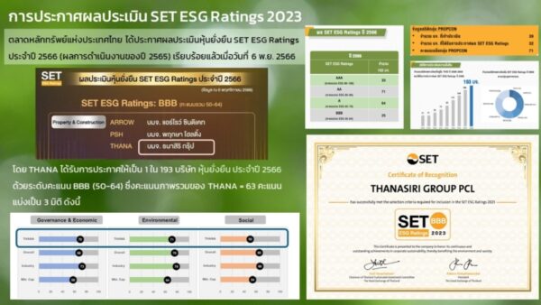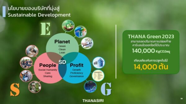 แนวคิดดังกล่าว เทียบเคียงได้กับ ESG ที่สะท้อนให้เห็นถึงแนวคิดเกี่ยวกับการพัฒนาองค์กรอย่างยั่งยืนที่คำนึงถึงความรับผิดชอบของบริษัท 3 ด้านหลัก คือ สิ่งแวดล้อม (Environment) สังคม (Social) และการกำกับดูแล (Governance) สู่แนวทางในการกำหนดเป้าหมายและการดำเนินงาน โดยมีกลยุทธ์ Total Green Real Estate Development – Services เป็นตัวขับเคลื่อนอย่างครอบคลุมในทุกมิติ แสดงให้เห็นถึงหัวใจสำคัญของ “ธนาสิริ” กับแบรนด์นักพัฒนาสังคมน่าอยู่มากกว่านักสร้างบ้าน