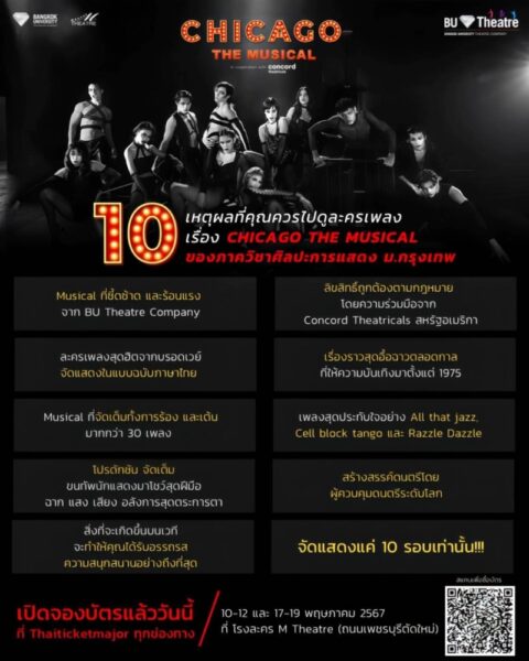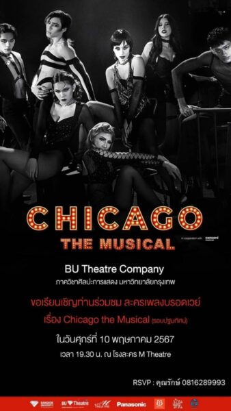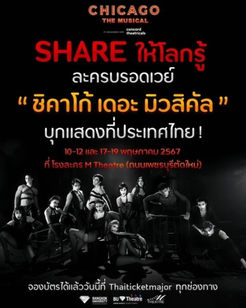 BU Theatre Company ร่วมกับ โรงละคร เอ็ม เธียเตอร์ และ Concord Theatricals ประเทศสหรัฐอเมริกา ขอเสนอละครเพลง เรื่อง”ชิคาโก้ เดอะ มิวสิคัล (Chicago the Musical)” ละครเพลงสุดฮิตจากบรอดเวย์ จัดแสดงในแบบฉบับภาษาไทย หนึ่งเดียวในไทยที่ได้รับลิขสิทธิ์ถูกต้อง