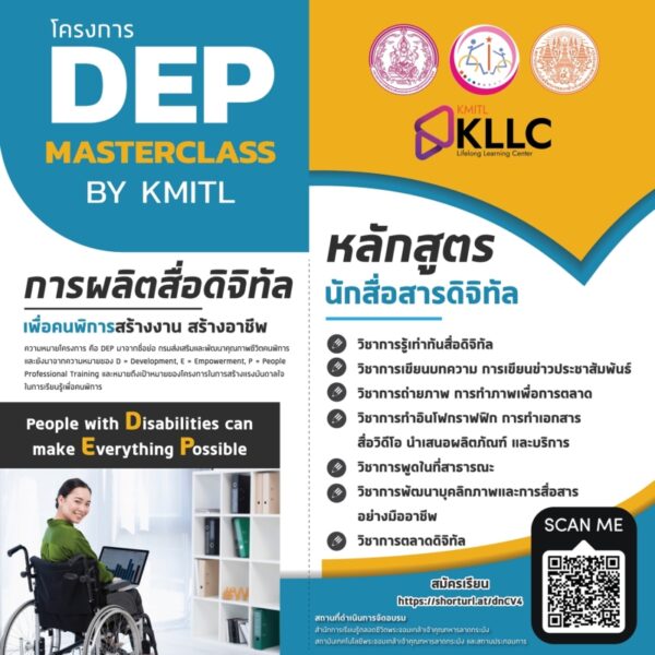 สำนักการเรียนรู้ตลอดชีวิตพระจอมเกล้าเจ้าคุณทหารลาดกระบัง (KLLC) ภายใต้สังกัดสถาบันเทคโนโลยีพระจอมเกล้าเจ้าคุณทหารลาดกระบัง เปิดโครงการ DEP หลักสูตร “นักสื่อสารดิจิทัล เพื่อคนพิการ สร้างงาน สร้างอาชีพ” โดยมี ผศ.ดร.ทอแสงรัศมี ถีถะแก้ว ผู้ช่วยอธิการบดีฝ่ายสื่อสารองค์กร เป็นหัวหน้าโครงการ พร้อมด้วย รศ.ดร.จรสวรรณ โกยวานิช ผู้อำนวยการ KLLC, คุณหญิง ดร. สุมาลี อุทัยเฉลิม กรรมการสภาสถาบันฯ เข้าร่วมงานแถลงข่าวโครงการการขยายผลเครือข่ายอุดมศึกษาเพื่อพัฒนาศักยภาพคนพิการ ในงานแถลงข่าวยังได้รับเกียรติจาก นายวราวุธ ศิลปอาชา รัฐมนตรีว่าการกระทรวงการพัฒนาสังคมและความมั่นคงของมนุษย์ กล่าวเปิดโครงการ