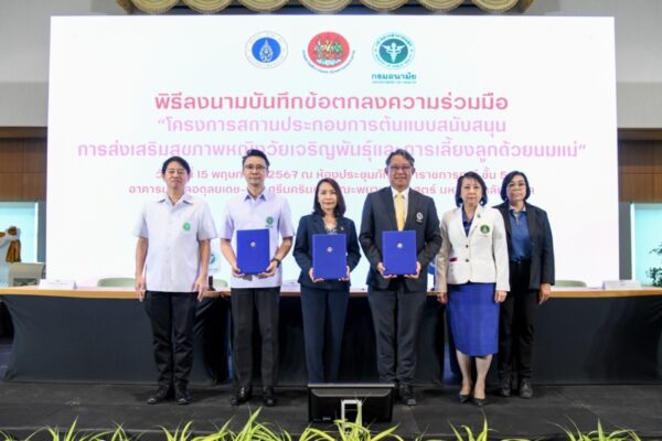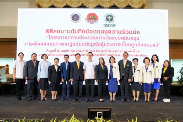 วันที่ 15 พฤษภาคม 2567 มหาวิทยาลัยมหิดล ร่วมกับ กรมสวัสดิการและคุ้มครองแรงงาน กระทรวงแรงงาน และกรมอนามัย กระทรวงสาธารณสุข จัดพิธีลงนามบันทึกข้อตกลงความร่วมมือจัดทำโครงการ สถานประกอบการต้นแบบสนับสนุนการส่งเสริมสุขภาพหญิงวัยเจริญพันธุ์และการเลี้ยงลูกด้วยนมแม่ โดยมีคุณโสภา เกียรตินิรชา อธิบดีกรมสวัสดิการและคุ้มครองแรงงาน กระทรวงแรงงาน นายแพทย์เอกชัย เพียรศรีวัชรา รองอธิบดีกรมอนามัย กระทรวงสาธารณสุข รองศาสตราจารย์ ดร.เภสัชกรสมภพ ประธานธุรารักษ์ รองอธิการบดีฝ่ายแผน พัฒนาคุณภาพและบริการวิชาการ มหาวิทยาลัยมหิดล รองศาสตราจารย์ ดร.เอมพร รตินธร คณบดีคณะพยาบาลศาสตร์ มหาวิทยาลัยมหิดล ร่วมลงนามในบันทึกข้อตกลงความร่วมมือ ณ ห้องประชุมภัทรมหาราชการุณย์ ชั้น 5 อาคารมหิดลอดุลยเดช-พระศรีนครินทร คณะพยาบาลศาสตร์ มหาวิทยาลัยมหิดล ศาลายา จังหวัดนครปฐม