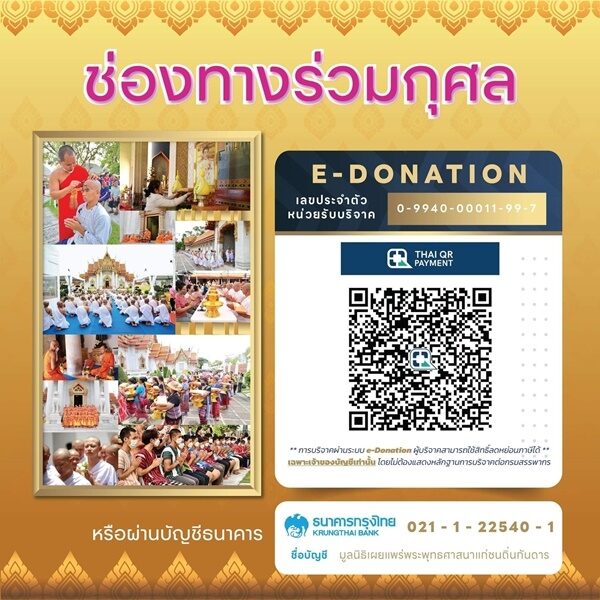 ร่วมเป็นเจ้าภาพตามจิตศรัทธา ได้ที่บัญชีมูลนิธิเผยแพร่พระพุทธศาสนาแก่ชนถิ่นกันดาร ธนาคารกรุงไทย สาขาสะพานขาว เลขที่บัญชี 021-1-22540-1 ขออนุโมทนาทุกท่านที่ร่วมเป็นเจ้าภาพในครั้งนี้