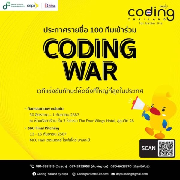 สำหรับกิจกรรม Coding War รอบ Final มหกรรมการแข่งขันทักษะโค้ดดิ้งใหญ่ที่สุดของประเทศไทยจะจัดขึ้นที่ MCC Hall เดอะมอลล์ ไลฟ์สโตร์ บางกะปิ ระหว่างวันที่ 13 – 15 กันยายนนี้ เพื่อเฟ้นหาสุดยอดผลงาน ชิงเงินรางวัลรวมมูลค่ากว่า 1 ล้านบาท และรับสิทธิ์เข้าร่วมแข่งขันโค้ดดิ้งเวทีระดับนานาชาติ อย่าง Seoul International Invention Fair 2024 (SIIF 2024) ณ สาธารณรัฐเกาหลี