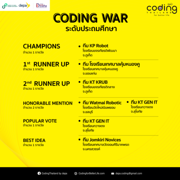 รางวัลการแข่งขัน Coding War แบ่งเป็น 2 ระดับ ประกอบด้วย ระดับประถมศึกษา และระดับมัธยมศึกษา โดยผลการแข่งขัน มีรายละเอียด ดังนี้