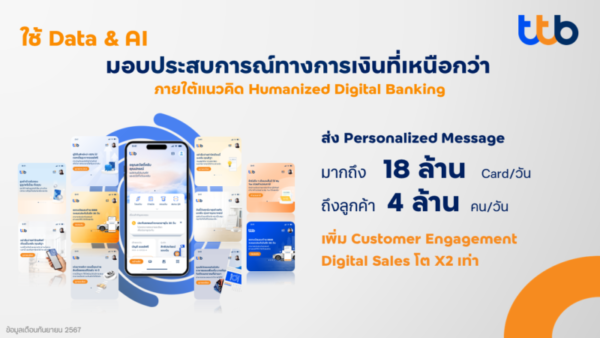 ด้วยพื้นฐานข้อมูลที่แข็งแกร่ง ทีทีบีได้นำดิจิทัลมาดูแลลูกค้าให้ครอบคลุมทุกกลุ่มในทุกช่วงชีวิตและ AI เชิงสร้างสรรค์มาขับเคลื่อนการเติบโตและการดำเนินงาน เสริมศักยภาพพนักงานในการนำข้อมูลมาใช้ เพื่อสร้างวัฒนธรรมองค์กรที่ขับเคลื่อนด้วยข้อมูล (Data-driven Culture) ซึ่งไม่เพียงช่วยเพิ่มประสิทธิภาพในการดำเนินงาน แต่ยังสร้างผลกระทบเชิงบวกต่อการเติบโตขององค์กร ช่วยให้ทีทีบีก้าวสู่การเป็นธนาคารดิจิทัลที่ล้ำสมัยในตลาดการเงินของไทย
