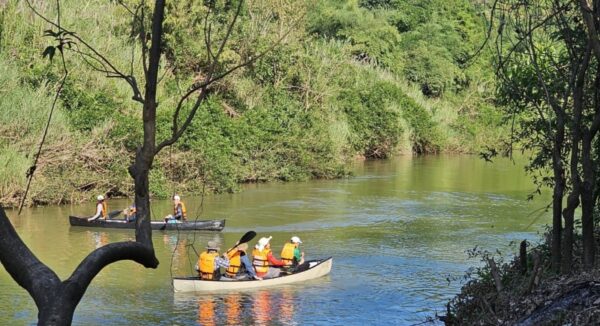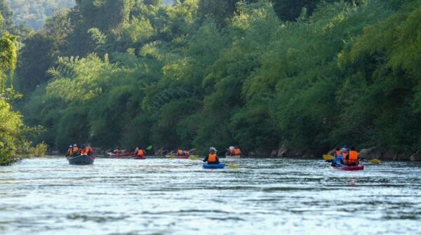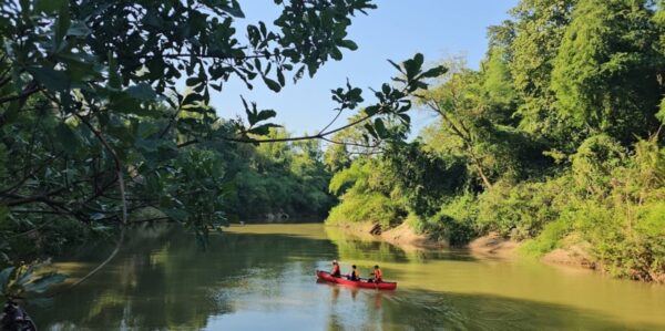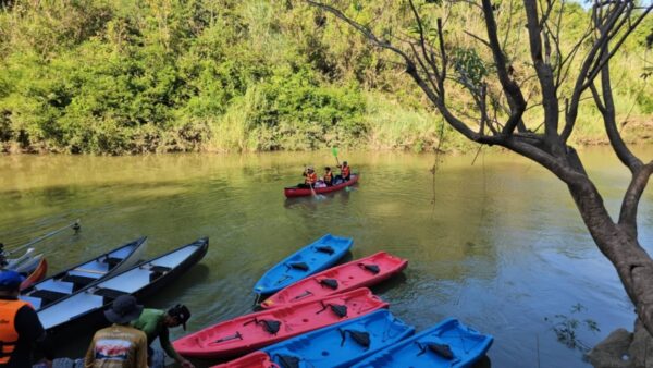 วันนี้เราจะล่องป่าสัก พายเรือแคนนู พายเรือคายัคกัน ก็ทั้งหมด 15 ลำ ระยะทาง 3 กิโลเมตร จากท่าที่วัดศรีวังม่วง ไปขึ้นที่ท่าสะบก สองฟากฝั่งจะสามารถสัมผัสทั้งป่าทั้งธรรมชาติสวยงาม เสน่ห์ของการพายเรือคายัคในครั้งนี้ นอกจากสองข้างทางที่สวยงามแล้ว เสน่ห์อีกจุดหนึ่งคือ ชมผาหมีเหนือ เสือใต้ Unseen แห่งใหม่ของสระบุรี ซึ่งเมื่อล่องลำน้ำไปได้สักระยะเราจะไปแวะที่จุดชมวิวที่ ผาหมีเหนือ เสือใต้ ตรงนั้นจะเป็นจุดไฮไลท์ซึ่งสวยงามมาก