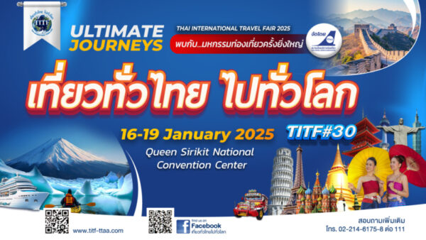 สมาคมไทยบริการท่องเที่ยว (TTAA) เดินหน้าจัดงานมหกรรมท่องเที่ยวครั้งยิ่งใหญ่แห่งปี “เที่ยวทั่วไทย ไปทั่วโลก” ครั้งที่ 30 Thai International Travel Fair 2025 (TITF#30) ระหว่างวันที่ 16–19 มกราคม 2568 เวลา 10.00-20.00 น. ณ Exhibition Hall 5-6 ศูนย์การประชุมแห่งชาติสิริกิติ์ วัตถุประสงค์เพื่อส่งเสริมอุตสาหกรรมการท่องเที่ยว กระตุ้นให้เกิดการเดินทางท่องเที่ยวทั้งภายในประเทศ และต่างประเทศ ให้นักท่องเที่ยวได้มีโอกาสพบปะกับผู้ประกอบการธุรกิจท่องเที่ยวโดยตรง พร้อมรับโปรโมชั่นและส่วนลดมากมายภายในงาน ทั้งแพคเกจทัวร์เส้นทางต่างๆ ตั๋วเครื่องบินราคาพิเศษ ห้องพักราคาพิเศษ รวมถึงเพื่อส่งเสริมและสนับสนุนธุรกิจการท่องเที่ยว สายการบิน โรงแรมที่พัก บริษัททัวร์ ที่มีคุณภาพและมาตรฐาน