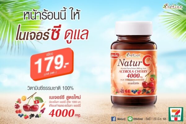 “บีไชน์ เนเจอร์ซี สูตรใหม่” (B Shine NaturC) วิตามินซีจากธรรมชาติ 100 % ด้วยสารสกัดอะเซโรลา เชอร์รี่ 1000 มก. เทียบเท่ากับผลอะเซโรลาเชอร์รี่สด 4000 มก. จากสวิตเซอร์แลนด์ ไม่ระคายเคืองต่อกระเพาะและลำไส้ ไม่ทำลายสารเคลือบฟัน และยังผสานคุณค่าจากสารสกัดผลไม้หลากหลายชนิด ได้แก่ สารสกัดจากทับทิม สารสกัดจากเมล็ดลิ้นจี่ เบอร์รี่รวม และแคโรทีนอยด์ ที่อุดมไปด้วยไฟโตนิวเทรียนท์ สารต้านอนุมูลอิสระประสิทธิภาพสูง ช่วยดูแลผิวพรรณให้แลดูสดใส พร้อมเสริมภูมิคุ้มกัน เหมาะสำหรับการดูแลสุขภาพในทุกวัน